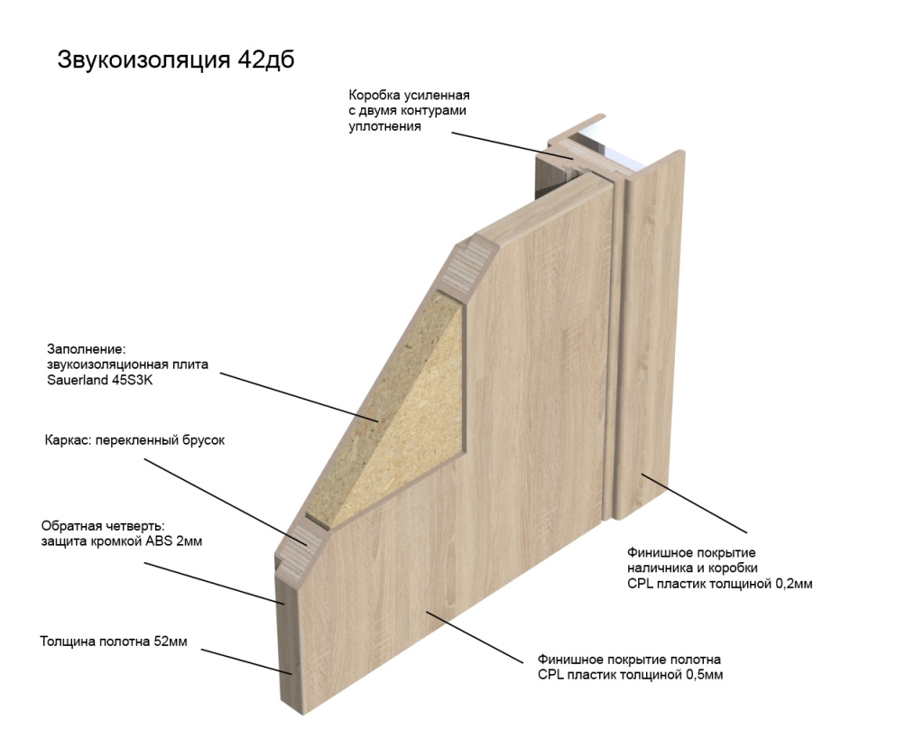 Уровень звукоизоляции измеряется в децибелах (дБ) и указывается на упаковке двери. Чем выше показатель, тем лучше звукоизоляция.
