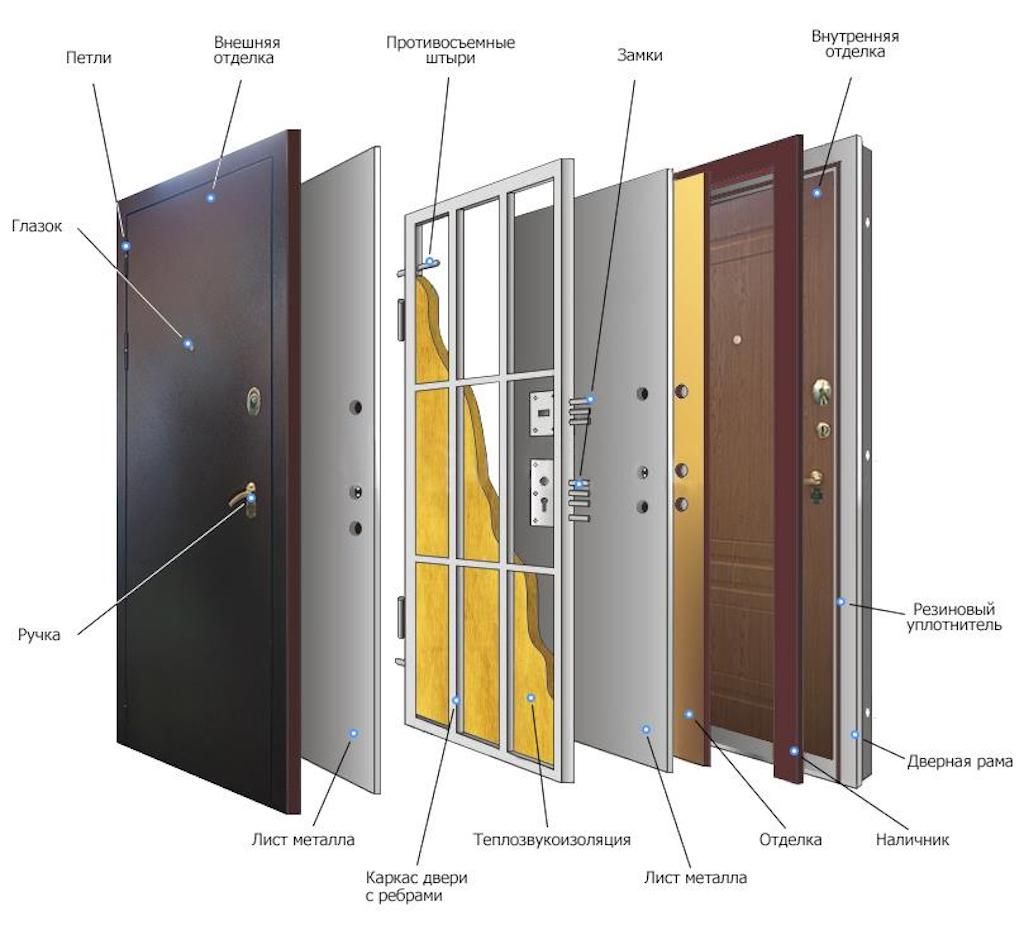 Помимо полотна, также стоит уделить не меньшее внимание используемой фурнитуре и замкам. Ведь даже качество фурнитуры может стать причиной проникновения к вам в квартиру непрошеных гостей. Например, когда используются наружные петли, но нет противосъемных ригелей. Так что в этом вопросе нет мелочей. Важна каждая петля, а также, безусловно, толщина стального листа и наличие ребер жесткости. О том, из чего состоит конструкция входной двери, куда должна открываться дверь и много другой полезной информации вы найдете здесь.
