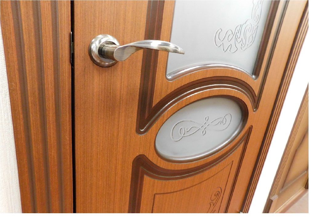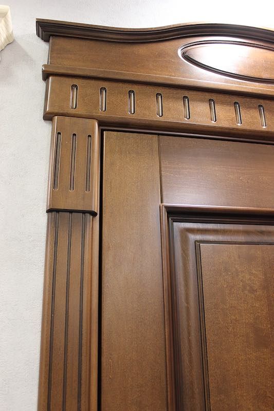 В данном случае каркас состоит из массива, то есть непосредственно сами несущие конструкции. А филенки, в свою очередь, не относящиеся к несущим элементам, делают из МДФ плит. Облицовку полотна, изготовленного по комбинированной технологии, можно выполнить по-разному. В том числе, экологичным и очень привлекательным внешне вариантом будет шпонирование полотна. Двери шпон на сайте Интерьер Уют также, разумеется, есть.