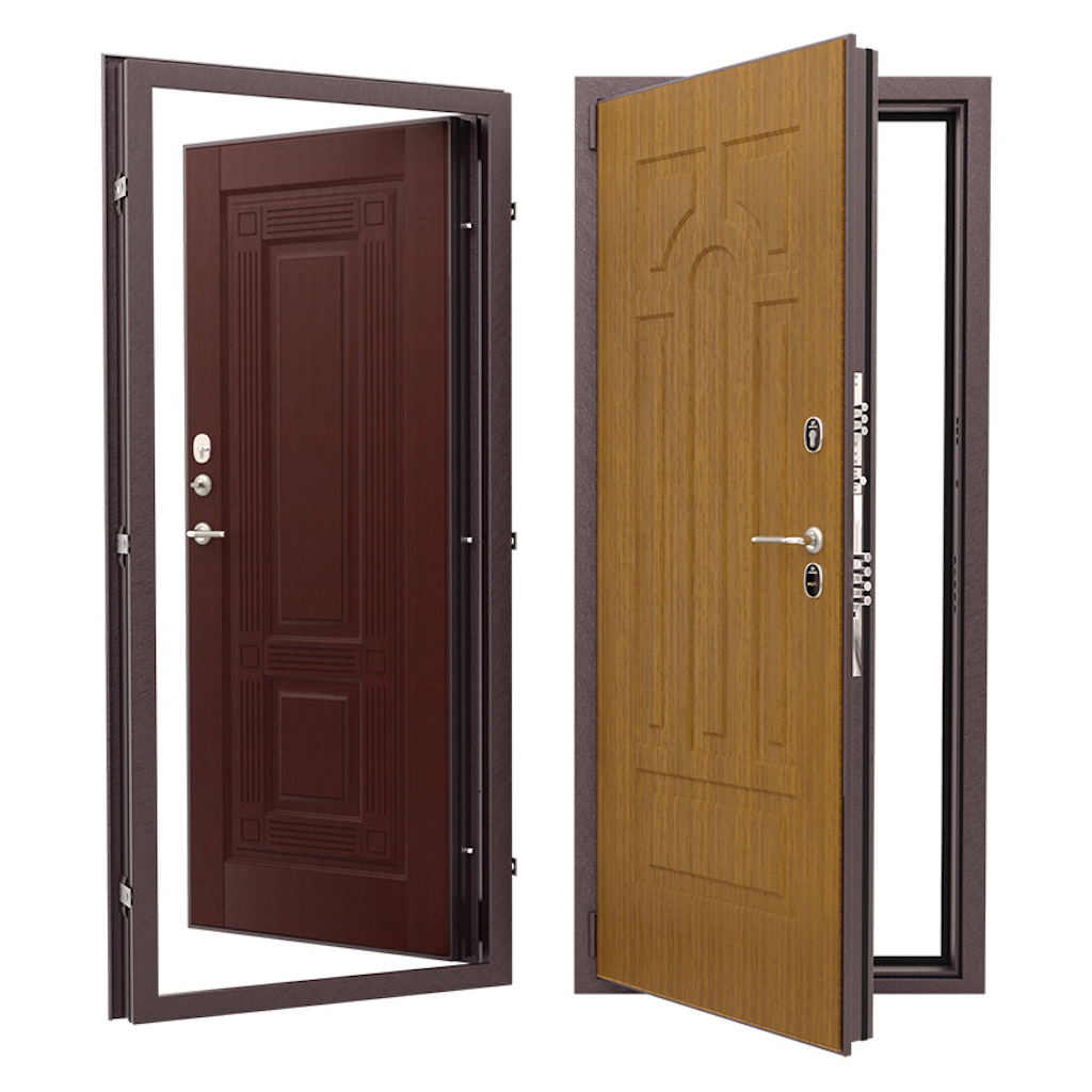 Мы бы хотели сказать несколько слов про отделку дверей наружную и внутреннюю. Казалось бы, ее можно выбирать, ориентируясь только на свои вкусовые предпочтения, но это не так. В частности, важно понимать, где будет установлена металлическая дверь. Например, если нужно купить входную дверь в загородный дом, то важно, чтобы она отлично справлялась с перепадами температуры и влажности. Ведь, в отличие от подъезда дома, дверь находится непосредственно на границы с улицей. Рассмотрим несколько вариантов отделки полотна: