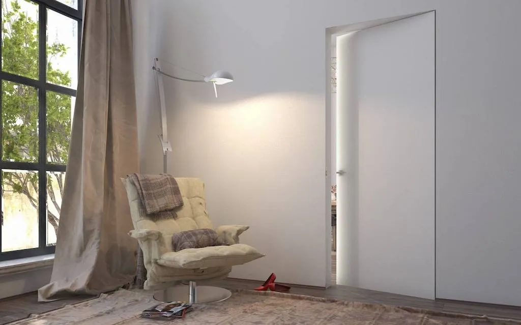 Начнем с того, что дадим определение этой интересной конструкции. Дверное полотно в обычном понимании всегда выделяется на фоне интерьера. И дело не только в оттенке полотна, но и в наличии дверной коробки. Также речь идет про объемные элементы относительно плоскости стены. То есть, когда перед нами установленные скрытые двери, то вы не видите полотно. Оно монтируется на скрытые петли вровень со стеной. Сам короб также скрыт в стене. Кроме того, при отсутствии наличников и покрытии полотна теми же материалами, с применением которых выполнена отделка стен, визуально они сливаются с интерьером.