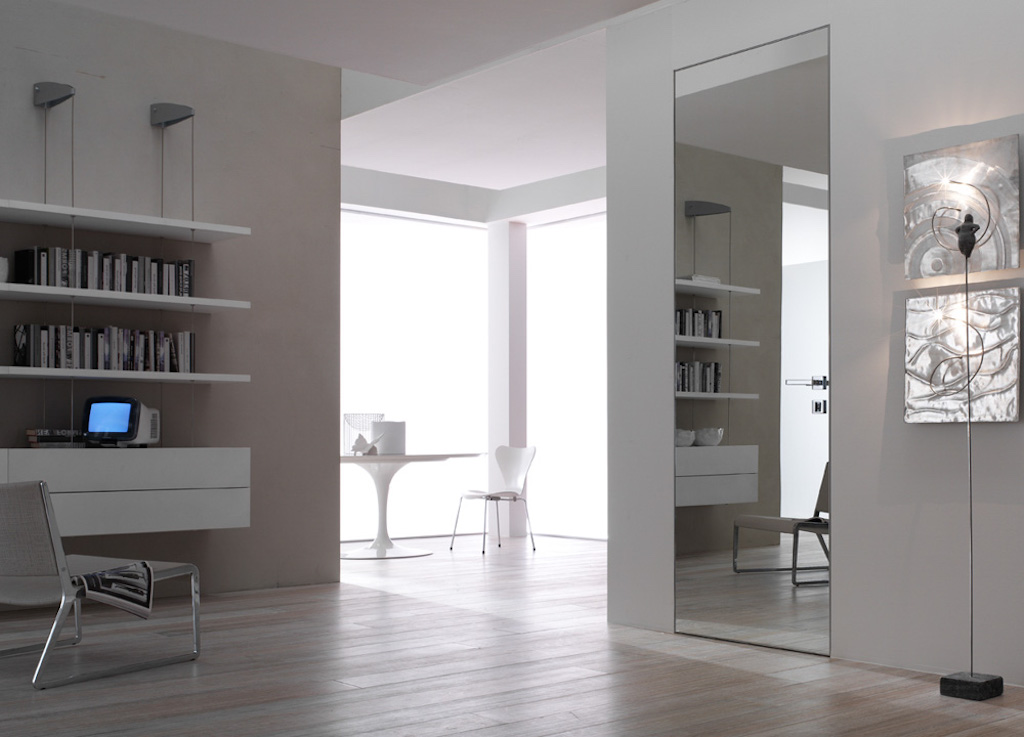 Скрытые зеркальные двери представляют собой инновационное решение, при котором зеркало крепится на готовое полотно. Одна сторона полотна подходит для покраски и интегрируется гармонично в стену, сохраняя общий стиль вашего интерьера. С другой стороны находится элегантное зеркало, которое, помимо своей очевидной функции, создает впечатление простора и увеличивает освещение в помещении.