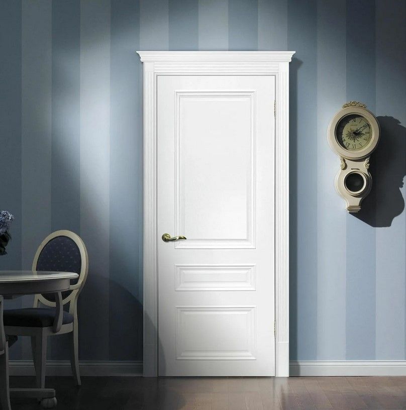 Их довольно много в разных вариациях, глухие и со стеклом, с патиной, покрытые эмалью. Например, это может быть дверь белая эмаль глухая (коллекция межкомнатные двери Люксор).
