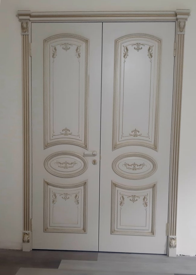 Конструкция двери филенчатая, полотно имеет художественную фрезеровку и широкий багет с нанесением патины.