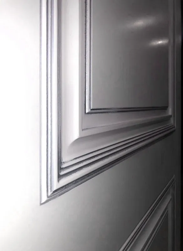 Конструкция двери филенчатая, полотно имеет объемные филенки и багет с нанесением патины.