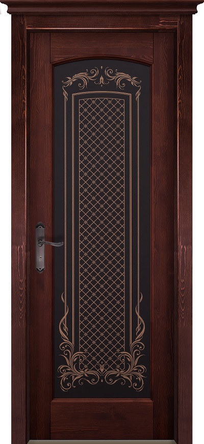 Дверь ОКА браш массив сосны Витраж махагон, стекло графит каленое с узором