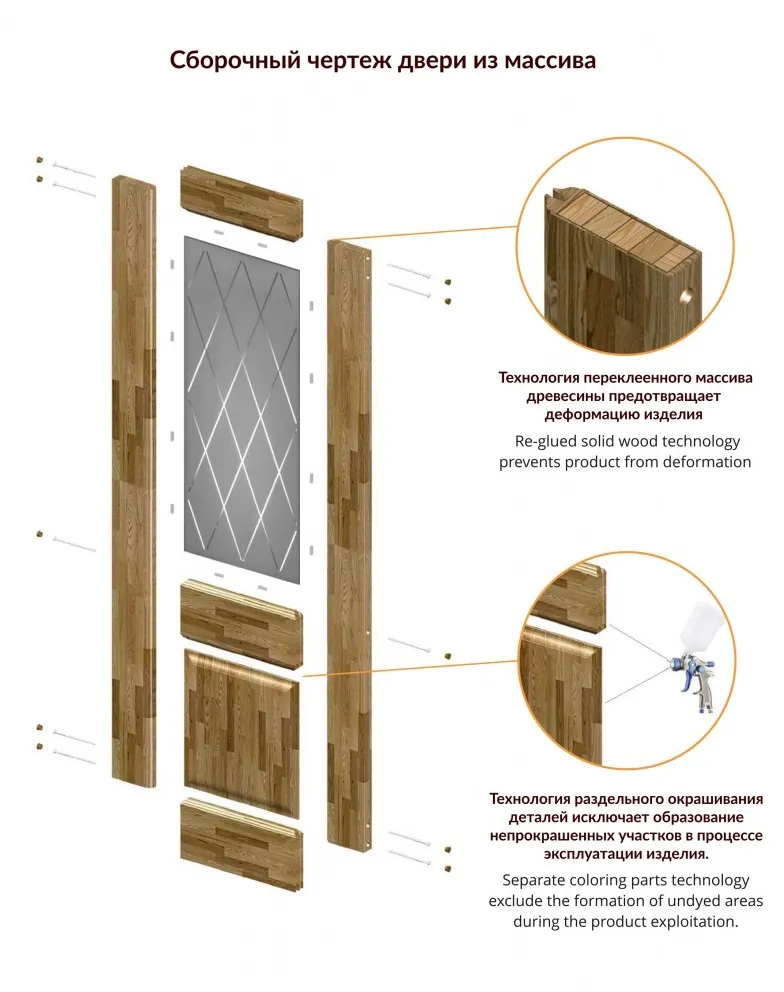 Вся конструкция двери полностью сборная, каждая деталь окрашена индивидуально, поэтому при сезонных перепадах температуры, никогда не проявятся неокрашенные участки филенки. Филенки объемные 30 мм.