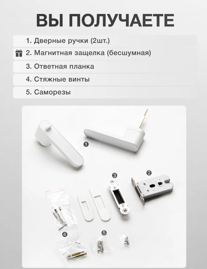 Комплект: ручка-2 шт, розетка-2 шт, магнитная защелка — 1ш, крепеж, шток-1 шт