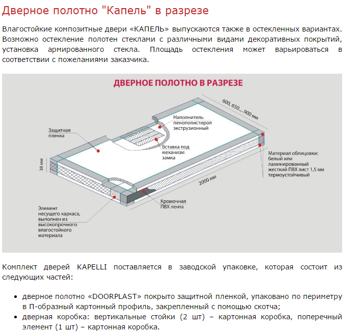 Это свойство делает дверь «КАПЕЛЬ» незаменимой в бассейнах, саунах, ванных комнатах, подвальных помещениях и помещениях спецназначения - везде, где существует повышенная влажность.