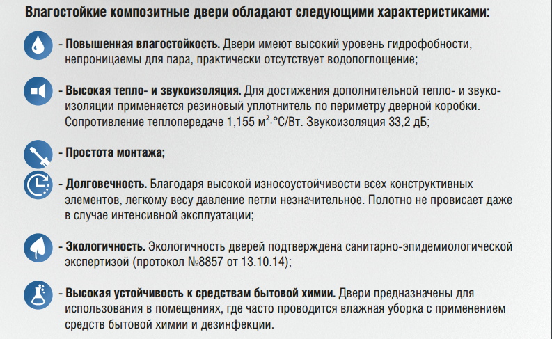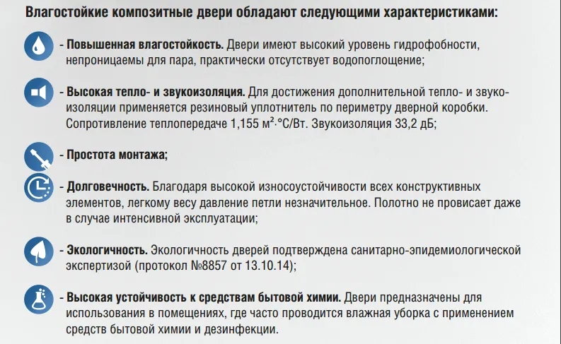 Благодаря уникальным свойствам применяемых материалов, специально разработанной технологии производства, промдверь «КАПЕЛЬ» имеет высокий уровень гидрофобности, непроницаема для пара, практически отсутствует водопоглощение. Следствием этого является отсутствие деформации и сохранение геометрии при любых эксплуатационных особенностях помещения.