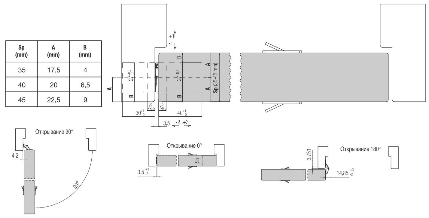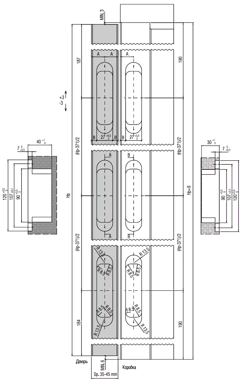 Размеры: высота 120 мм, межосевое расстояние 107 мм, ширина 27 мм, глубина врезки 30,5 мм и 40,5 мм