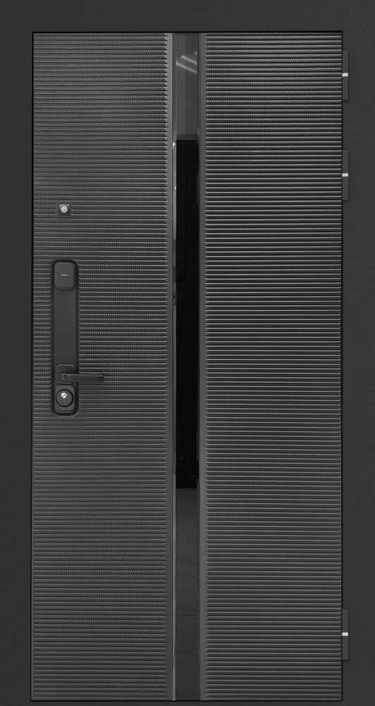 Внешняя отделка МДФ панель 10 мм, черный карбон (SJ36), ФЛС-594 (стекло черное с фацетом 15мм), с замочной стороны вставка под фурнитуру (черный муар) БЕЗ лазерной резки. БЕЗ МДФ наличника