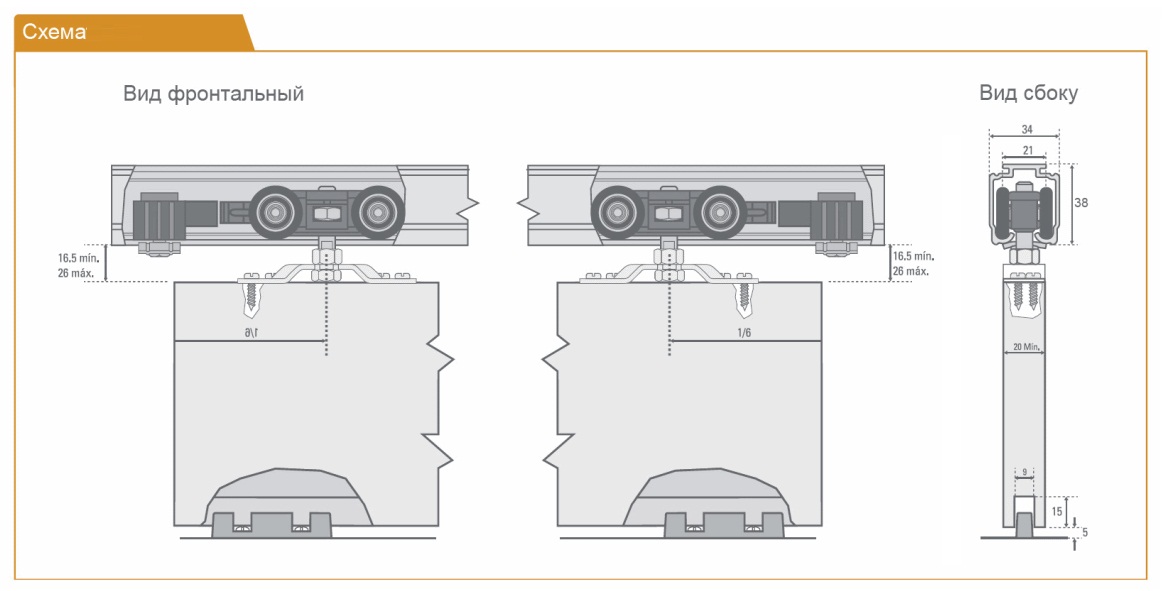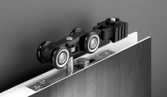 Четырехколесный раздвижной механизм закрытого типа с фиксатором и установочной пластиной к торцу двери. Фиксатор позволяет зафиксировать дверь в любом крайнем положении (открытом или закрытом)