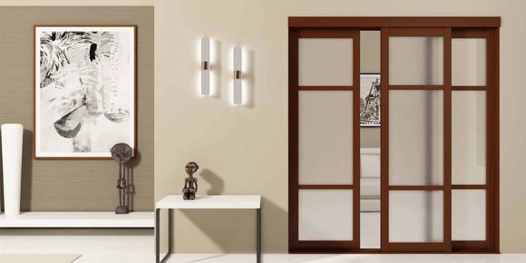 При монтаже раздвижных дверей по стене, есть два варианта установки ведущих створок: 1 - ведущее полотно монтируют первым от стены, 2 - ведущее полотно последнее от стены.