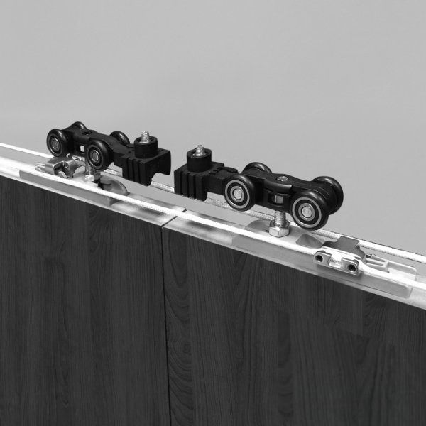 Cистема позволяет выдвигать/задвигать две двери с одной стороны проема, что позволяет экономить пространство с другой стороны проема. Воздействуя на одну дверь при помощи тросового привода, вторая дверь двигается автоматически.