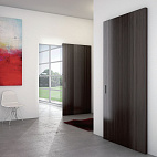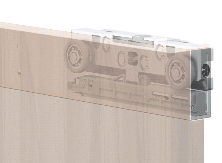 Комплект для раздвижного деревянного полотна без верхней направляющей. Уникальное техническое решение для раздвижных дверей с невидимым механизмом. Комплект имеет доводчики хода двери в обе стороны. Подвесная беспороговая система.