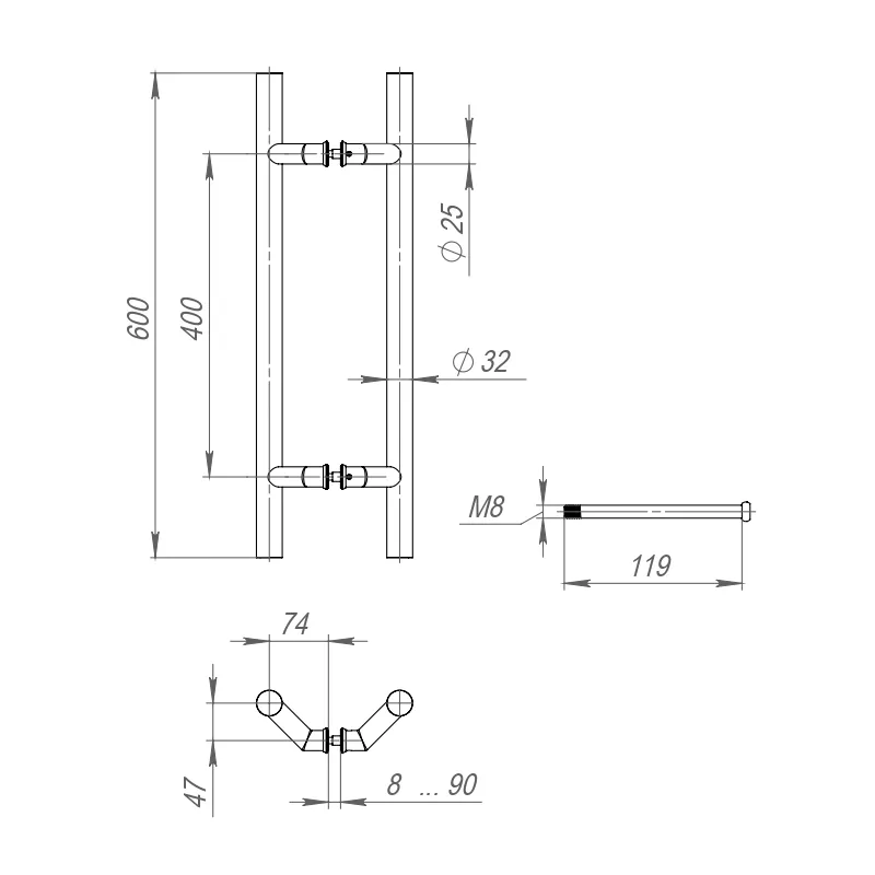 Изготовлена из высококачественной нержавеющей стали марки AISI 304 (INOX 304). Это обеспечивает превосходную устойчивость к коррозии, воздействию влаги и перепадам температур, что делает ручку идеальной для использования как внутри помещений, так и на улице.