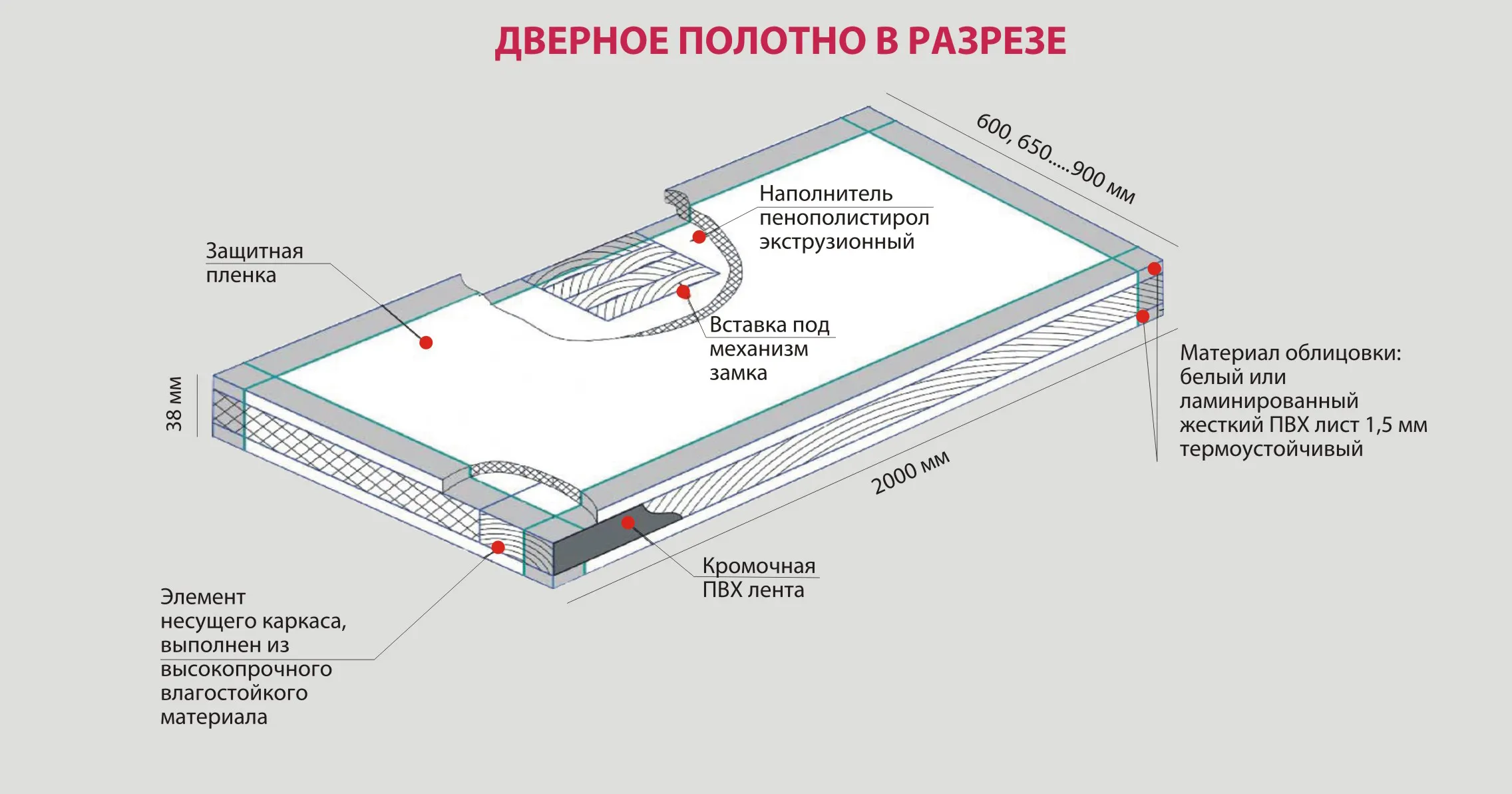 Стандартный размерный ряд: 600/2000 мм; 650/2000 мм; 700/2000 мм; 750/2000 мм; 800/2000 мм; 850/2000 мм; 900/2000 мм.