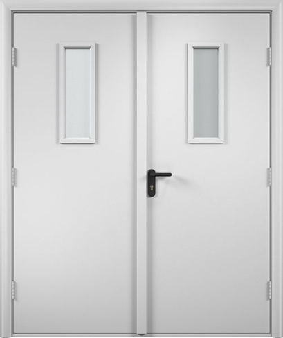 Фурнитура: Противопожарный замок под цилиндр с ключом; петли дверные (100 мм) с отделяемой картой для полотна; ручки противопожарные