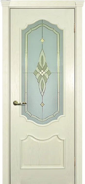Дверь Текона шпон Фрейм 01 ясень бисквит, витраж Афродита сатинат белый.