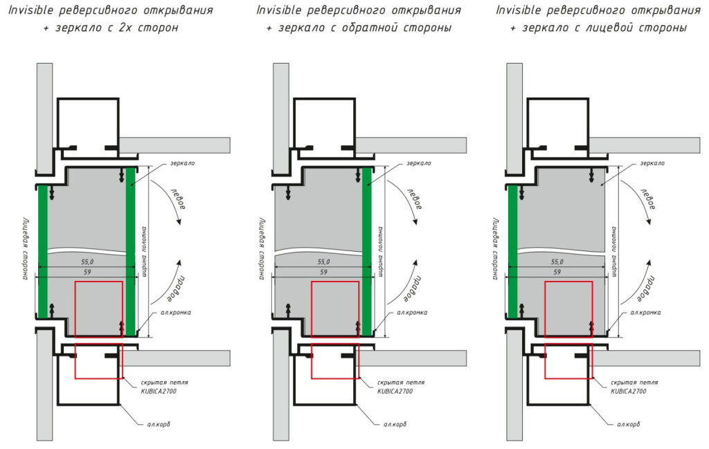 Дверь скрытая под покраску/зеркало ИУ2, 2,0 м, кромка AL, revers, 59 мм
