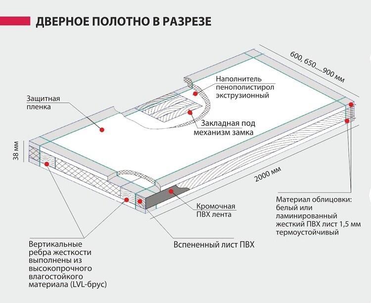 Толщина полотна 38 мм, высота — 2000 мм, а ширина может быть от 600 до 900 мм с шагом 50 мм, то есть 650 мм, 700 мм, 750 мм и так далее. Если рассмотреть полотно изделия, то оно имеет отличный от привычных вариантов состав. Основные элементы конструкции следующие: