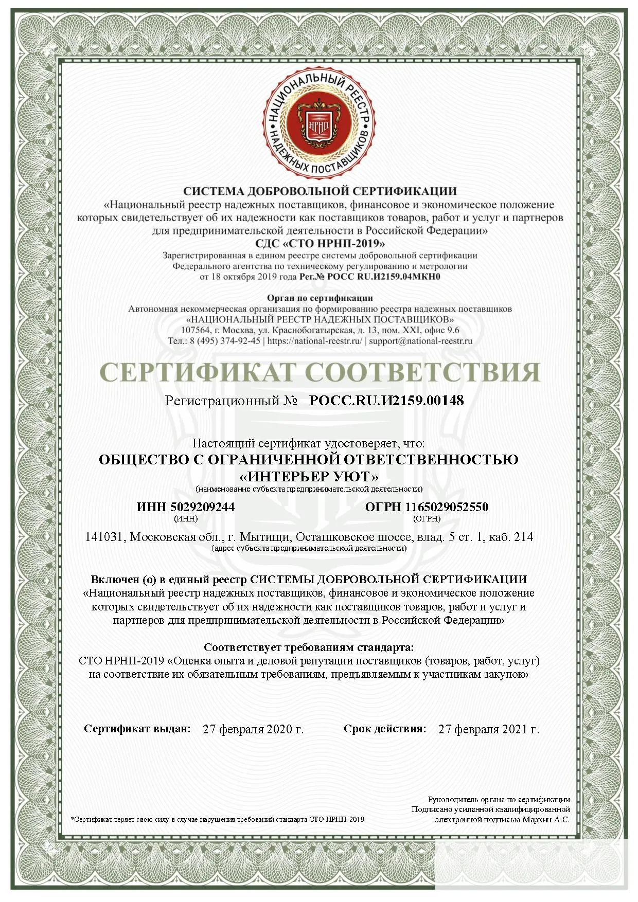 Юридический адрес: 141031, Московская обл., г. Мытищи, Осташковское шоссе, владение 5, стр. 1, кабинет 214